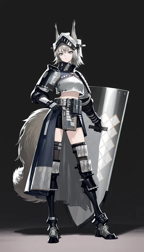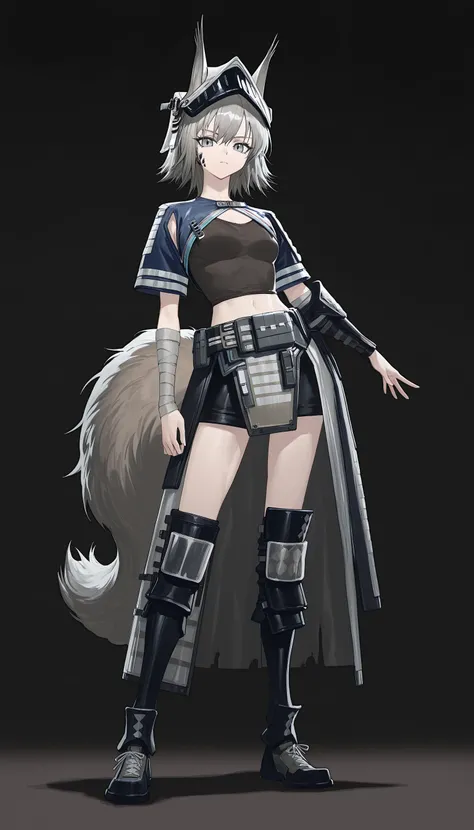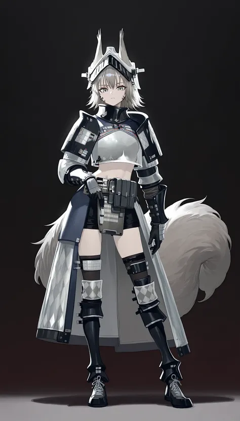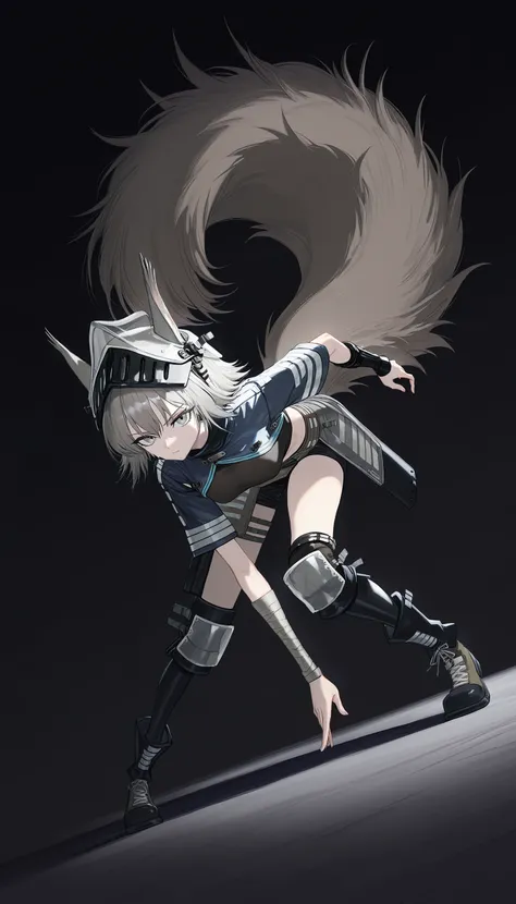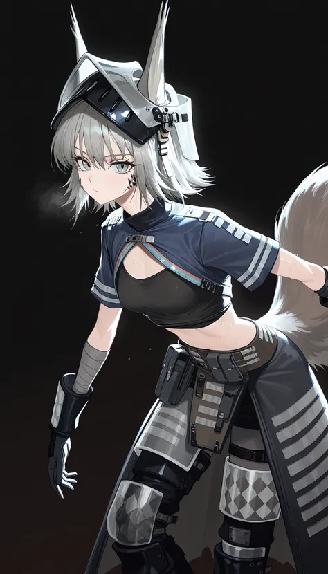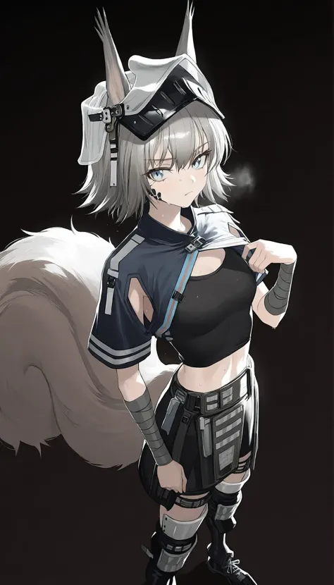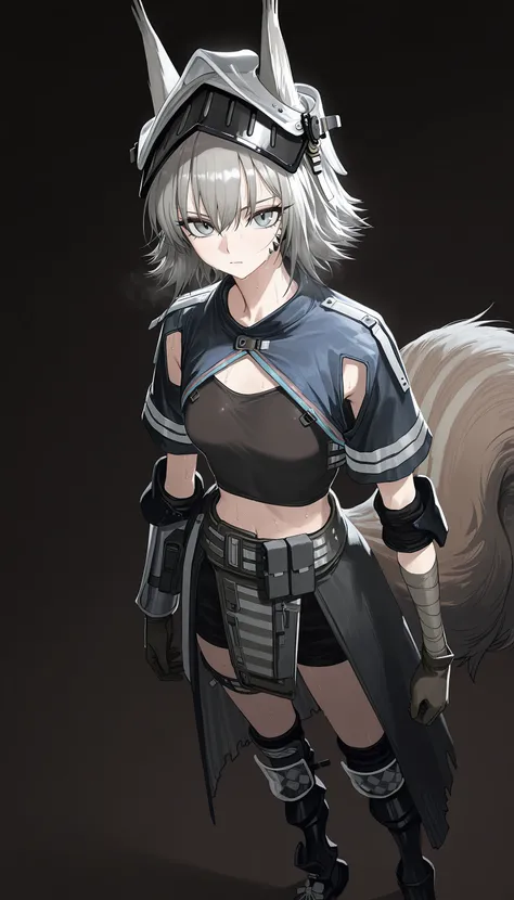 ashlock_\(arknights\), grey eyes , grey hair, squirrel ears, squirrel tail,short hair, gauntlets ,helmet, visor \(armor\), midriff ,black shorts,breastplate ,half skirt,black gloves,shoulder armor, black thighhighs, knee pads,pouch ,armored boots ,ashlock_\(elite_ii\), grey eyes , grey hair, squirrel ears, squirrel tail, large_tail, short hair, bandaged arms , visor \(armor\), midriff ,crop top ,short sleeves ,oripathy lesion (arknights),shrug_(clothing) , knee pads, armored boots ,
