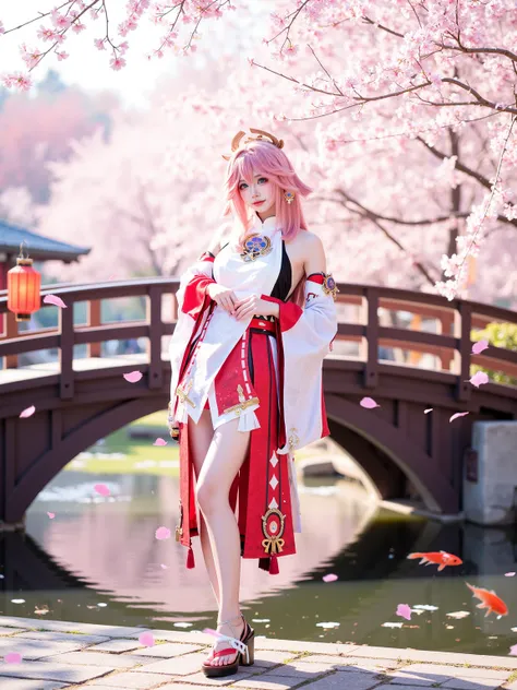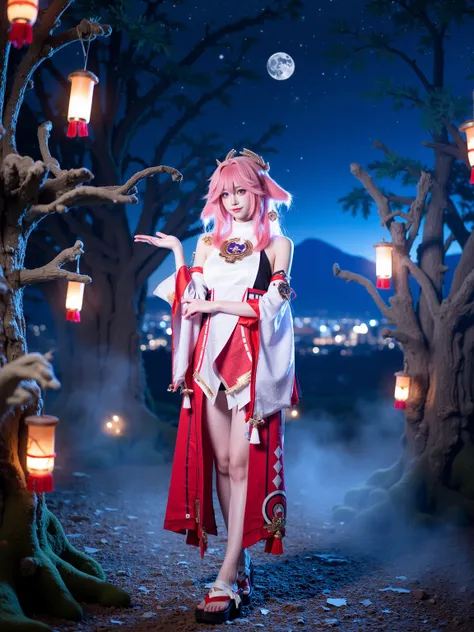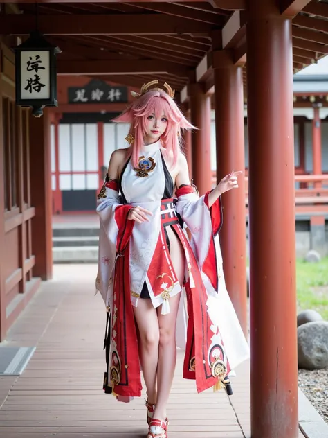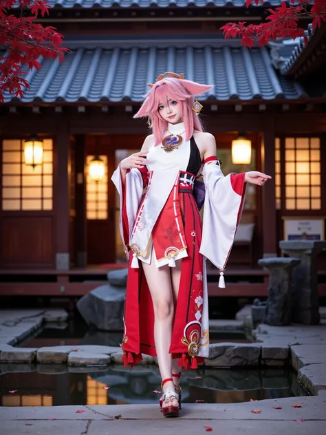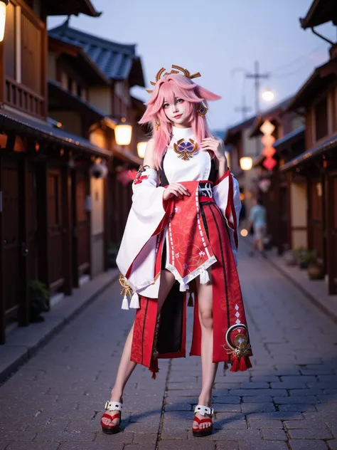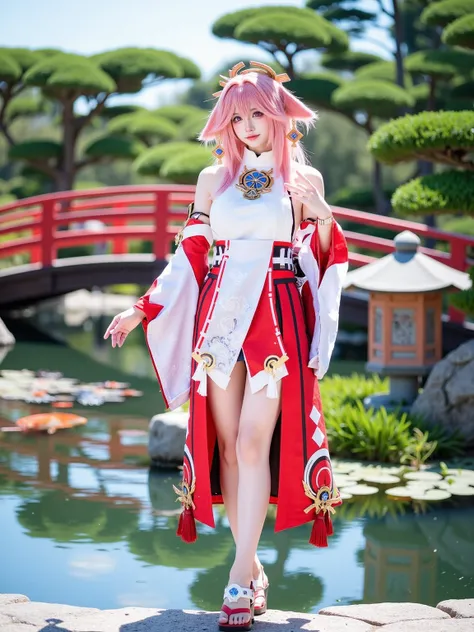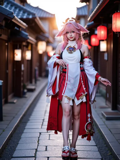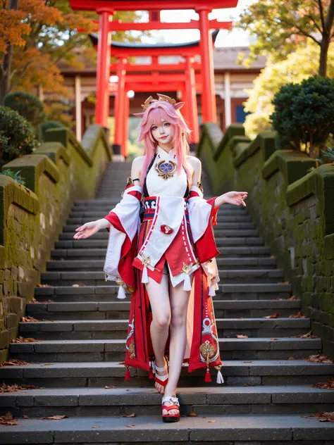 A realistic photo of a slender beautiful young woman in cyb-yaemiko cosplay costum. She is also wearing sandals. She has pink hair with fox ears and hair ornament.