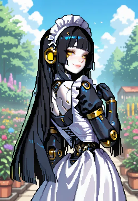 JABlH, 1girl, black hair, maid headdress, yellow eyes, long hair, sidelocks, robot ears, android, blunt bangs