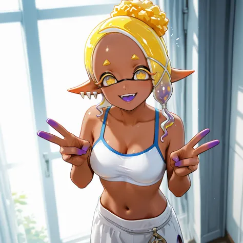 FryeSplatoon, 1girl, very dark skin, dark-skinned female, see-through, blonde hair, multiple earrings, yellow shirt, multicolored hair, fangs, jewelry, tentacle hair, pointy ears, crop top, navel, white pants, forehead, gradient hair, object on head, purple hair, cross-shaped pupils, two-tone hair, colored eyelashes, colored skin, sleeveless, symbol-shaped pupils, food on head, white socks, harem pants, yellow eyes, bare shoulders, tempura, poncho, turtleneck, toeless legwearFryeSplatoonHourglass, 1girl, solo, see-through shirt, tentacle hair, yellow shirt, medium breasts, dark skin, navel, dark-skinned female, yellow eyes, pointy ears, crop top, underwear, forehead, ear blush, blonde hair, turtleneck, purple skin, white pants, sleeveless, multicolored hair, gradient hair, cross-shaped pupils, two-tone hair, colored tongue, object on head, symbol-shaped pupils, midriff, multiple earringsFryeSplatoonRaider, 1girl, very dark skin, dark-skinned female, yellow shirt, crop top, blonde hair, navel, pointy ears, multiple earrings, fangs, tentacle hair, yellow eyes, jewelry, multicolored hair, medium breasts, colored skin, gradient hair, purple hair, underwear, headband, forehead, black bra, symbol-shaped pupils, midriff, bare shoulders, groin