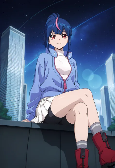 Hikari Myodo (Cardfight Vanguard), ponytail, multicolored hair, blue hair, streaked hair, pink hair, red eyes,white shirt, blue jacket, zipper pull tab, turtleneck, long sleeves, bike shorts under skirt, white skirt, black shorts, pleated skirt, grey socks, red footwear, boots,coat, black hood down, long sleeves, pantyhose, black footwear, boots,