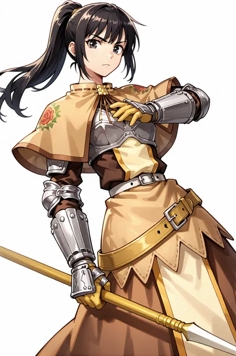 swdro, breastplate, brown capelet, dress, belt, armored gloves, long skirt, brown skirt, gauntlet, multiple belts, yellow gloves, boots