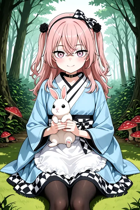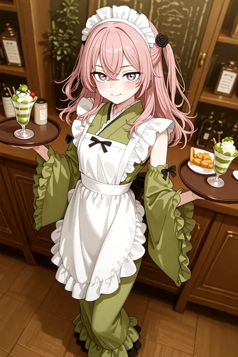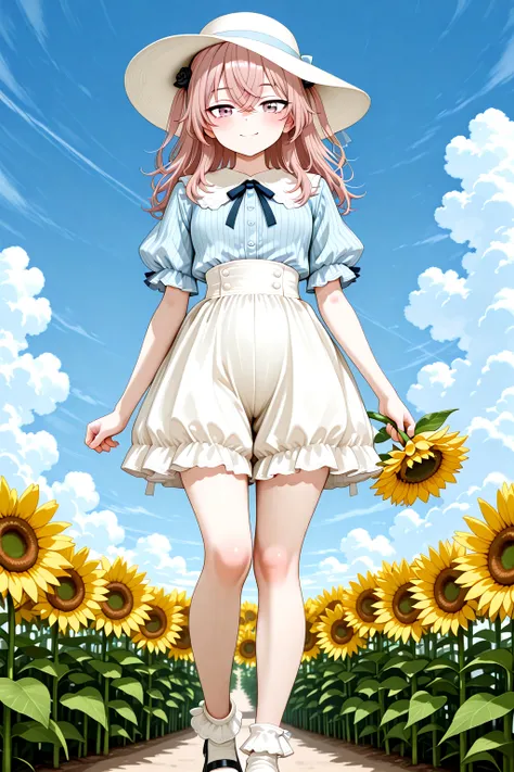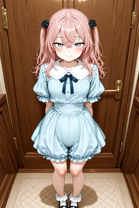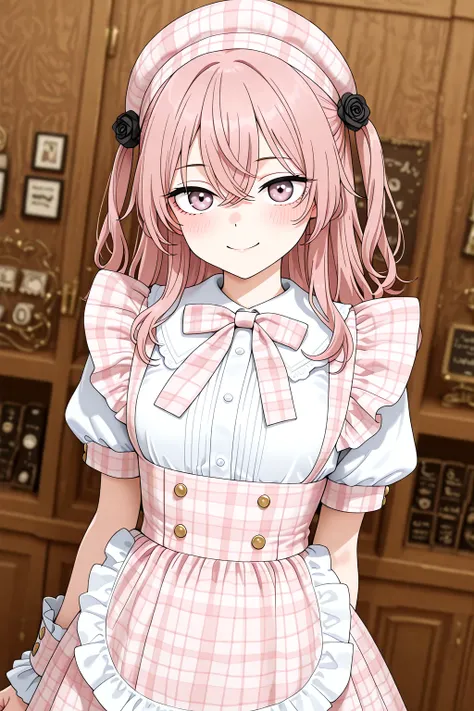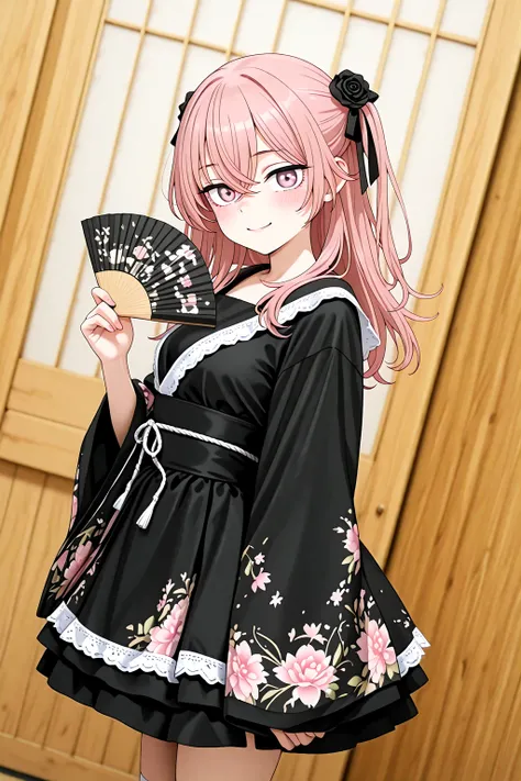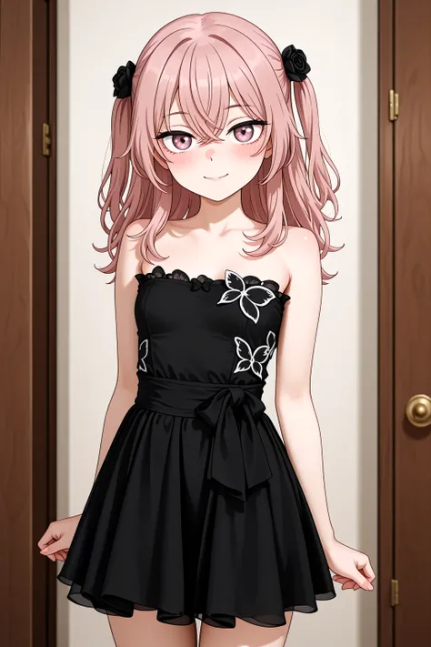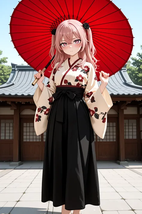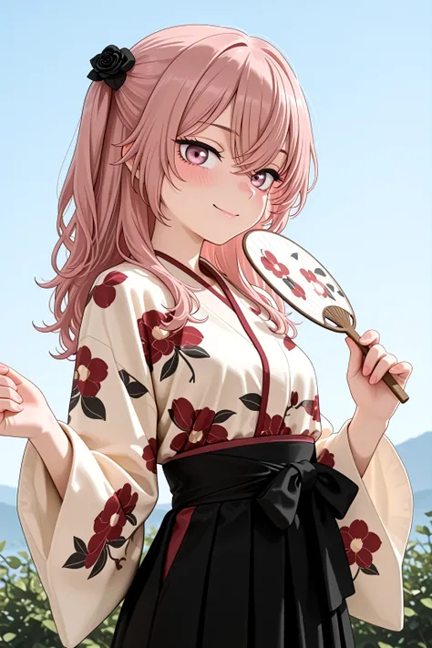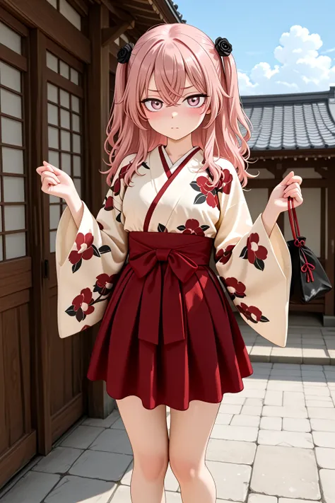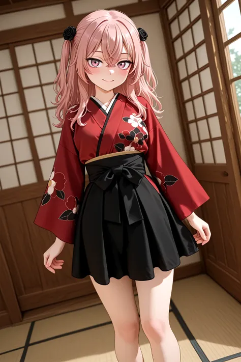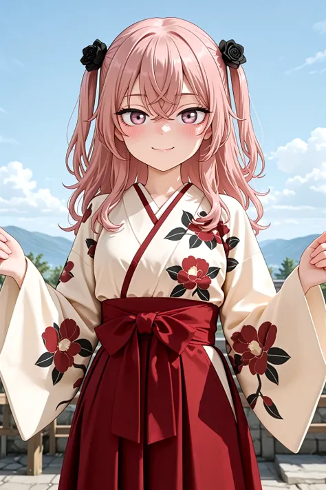 sajuna inui, inui sajuna, long hair, bangs, hair ornament, hair between eyes, pink hair, hair flower, pink eyes, two side up, crossed bangs, black flower, black rose, mature female, small breasts, anime screencap,shirt, bow, school uniform, white shirt, short sleeves, serafuku, sailor collar, yellow bow, red sailor collar, red skirt, sweater vest, black sweater vest,white shirt, short sleeves, collarbone,