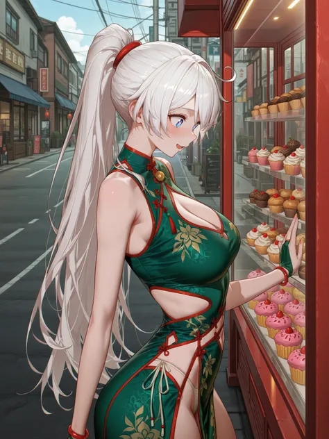 bnsBmbo, green dress,red trim, revealing clothes, sleeveless dress, side-tie dress, chinese clothes, china dress, side slit, front slit, red string, stomach cutout, pelvic curtain, fur_(clothing), stomach cutout, navel cutout, white string panties, clothing cutout, , bare_shoulders, clothing cutout, cleavage cutout, partially fingerless gloves, bridal gauntlets, bracelet