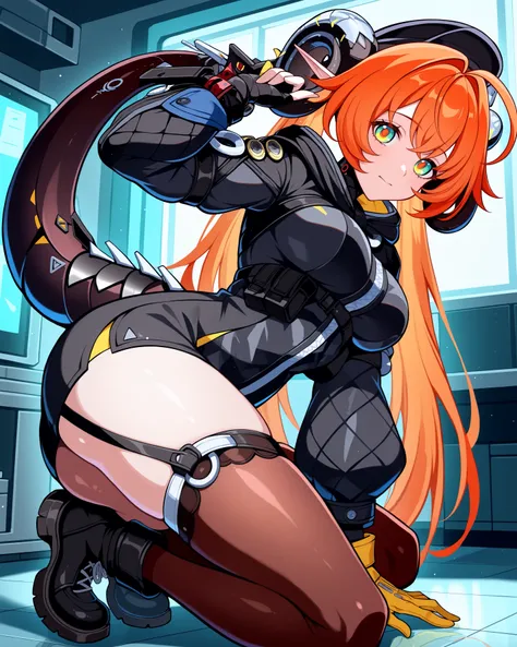 orpheuszzzlong hair, bangs, orange hair, dragon horns, horns, pointy ears, mechanical tail, twintails, green eyes, multicolored eyes, hair intakes, ahoge, hair between eyes,orpheuszzz, 1girl, gloves, black jacket, long sleeves, black headwear, brown thighhighs, fingerless gloves, black footwear, black gloves, yellow gloves, skindentation,garter straps, puffy sleeves, black headwear, hood, thigh strap,