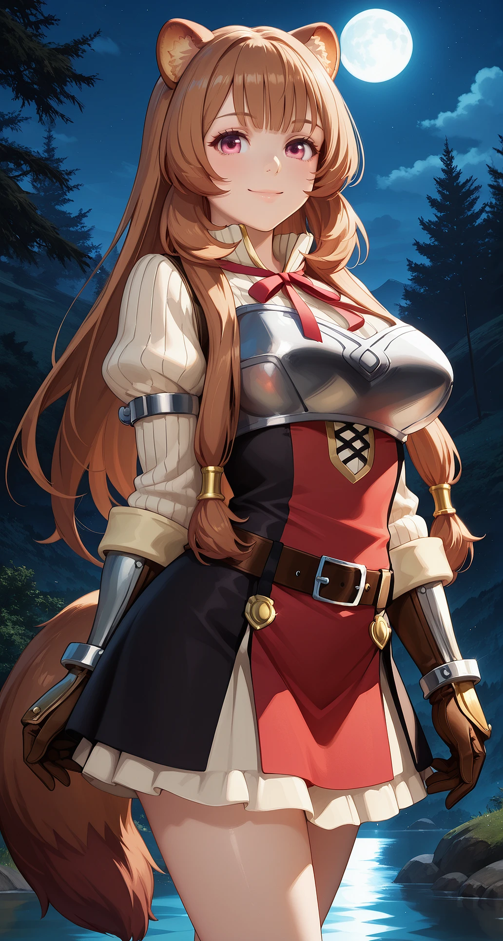 Raphtalia, long hair, bangs, brown hair, animal ears, raccoon ears, raccoon tail, raccoon girl, pink eyes, large breasts,long sleeves, sweater, ribbed sweater, puffy sleeves, breastplate, ribbon, red ribbon, gauntlets, glove, brown gloves, belt, skirt, armor,