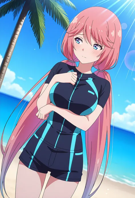 low twintails, swept bangs, hair between eyes, very long hair, pink hair, blue eyes, under-rim eyewearblazer, red jacket, collared shirt, white shirt, blue bowtie, long sleeves, miniskirt, pleated skirt, white skirt