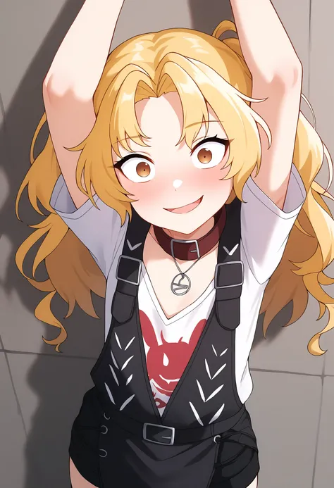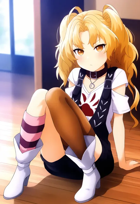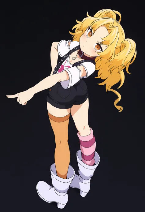 yuzuki_katagiri, 1girl, brown eyes, blonde hairasymmetrical legwear, single thighhigh, black shorts, boots, collar, collarbone, denim, denim shorts, high heels, necklace, outstretched arms, pink sock, short shorts, short sleeves, shorts, striped clothes, striped sock, white boots