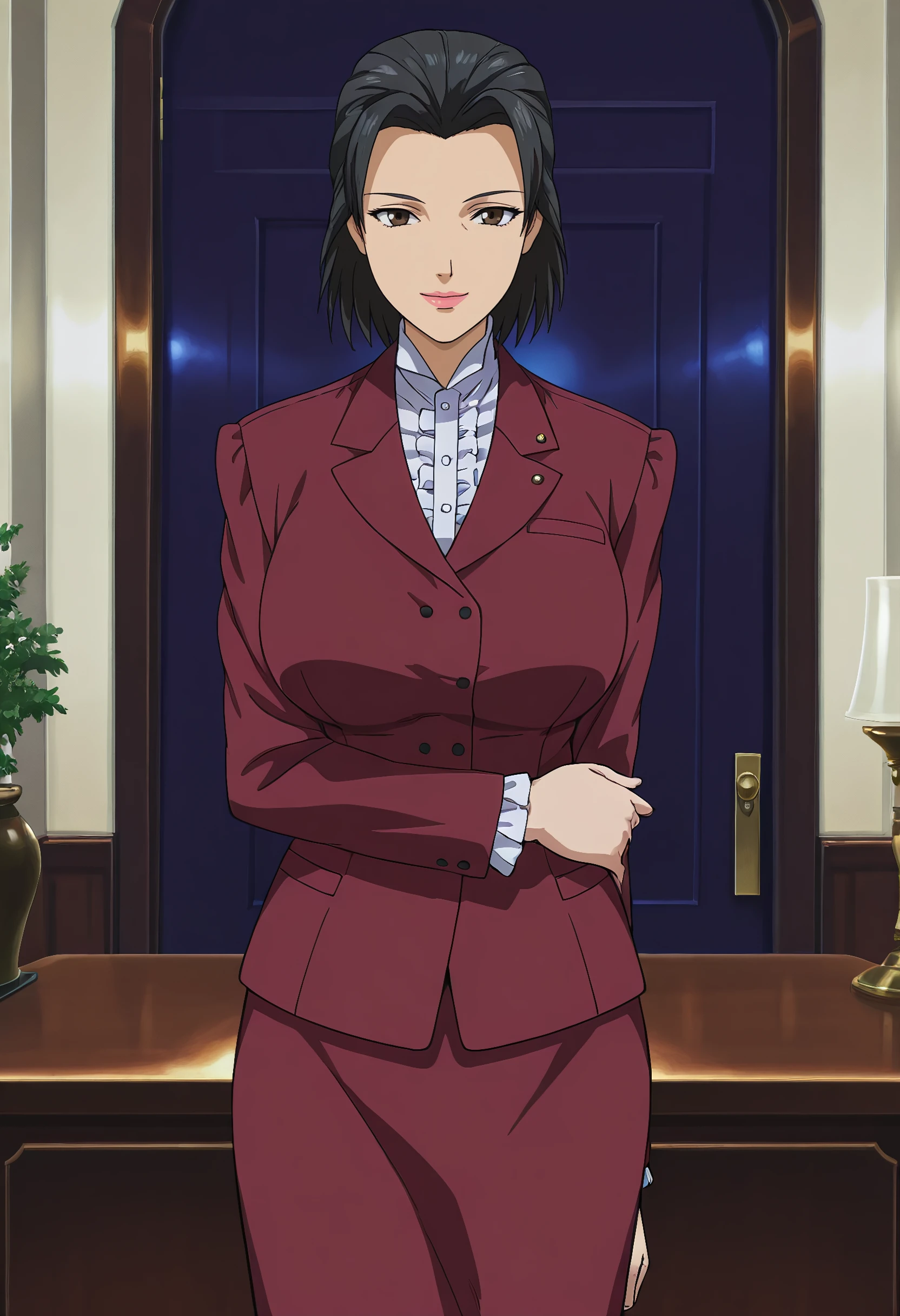 kayabukiyokosac, brown eyes, lipstick, short hair , black hair, red formal, pencil skirt