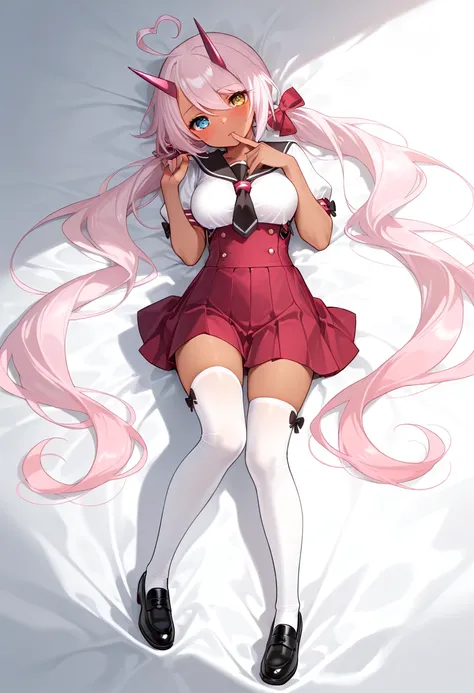 indidef, very long hair, light pink hair, heart ahoge, side ponytails, low twintails, heterochromia, blue eyes,yellow eyes,mechanical horns, ,dark skin, dark-skinned female,medium breasts, gorget, underboob, dark-skinned female, facepaint, white bandeau, sleeveless jacket, two-tone jacket, open jacket, cropped jacket, partially fingerless gloves, anchor, black shorts, short shorts, belt, single thighhigh, single kneehigh, white thighhigh, white kneehigh, asymmetrical legwear, high heels, rudder footwear,indidress,very long hair, light pink hair,white bow, hair bow, heart ahoge, side ponytails, low twintails, heterochromia, blue eyes, oni horns, hat feather, dark skin, dark-skinned female,asymmetrical horns, mini top hat, feather hair ornament, facepaint, medium breasts, black choker, sleeveless dress, two tone dress, black dress yellow dress, deep v-neck, cleavage cutout, feather trim, multicolored feathers, anklet, barefoot,indischool, blue eyes, yellow eyes, very long hair, light pink hair, heart ahoge, side ponytails, low twintails, red hair bow, heterochromia, oni horns,dark skin, dark-skinned female, medium breasts, underbust, black sailor collar, puffy short sleeves, black bow, white shirt, school uniform, pleated skirt, suspender skirt, high-waist skirt, red skirt, zettai ryouiki, white thighhighs, black loafers,
