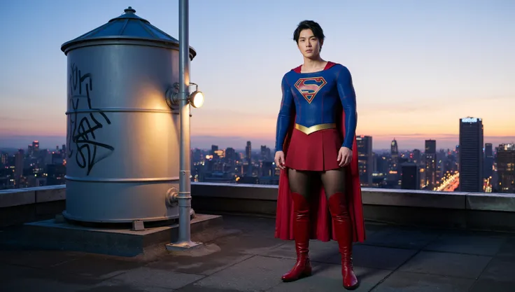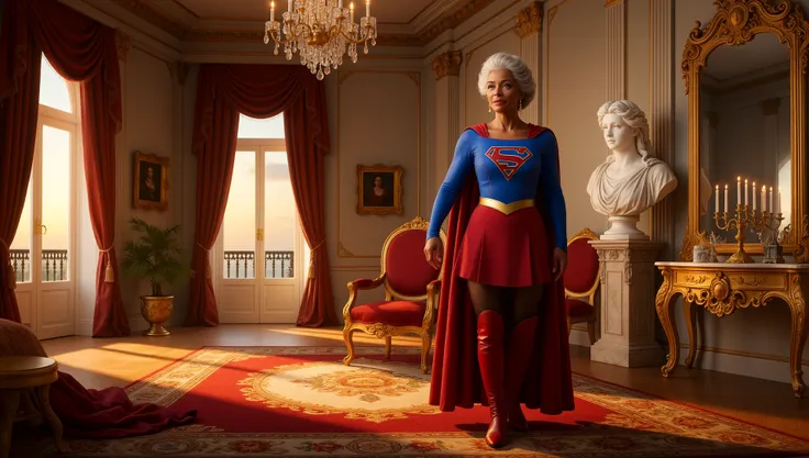 a blue sg shirt with a 'S' emblem and red stitching lines, a red sg cape, a golden sg belt, a red sg skirt, black sg tights, and red sg boots