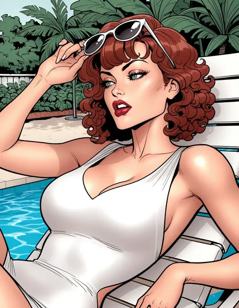 auburn hair, curly hair, eyelashes, green eyes, parted lipswestern comics \(style\)