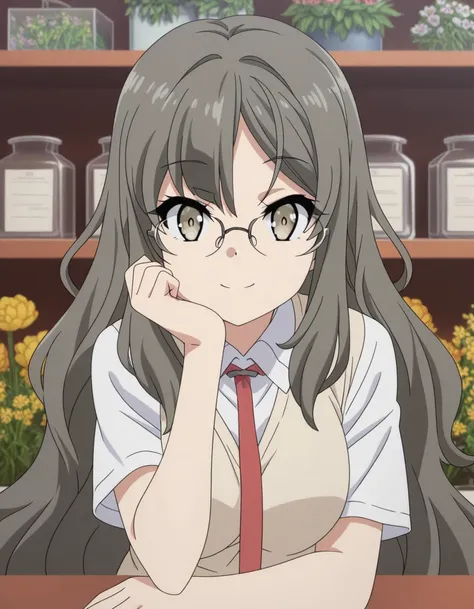 rio futaba, futaba rio, long hair, brown hair, brown eyes, yellow eyes, grey hair, glasses, mature female, large breasts, anime screencaprio futaba, futaba rio, long hair, brown hair, brown eyes, yellow eyes, grey hair, mature female, large breasts, anime screencapshirt, long sleeves, collarbone, black shirt, cardigan, pink cardigan