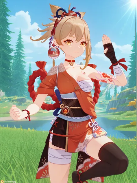 yoimiya, yoimiya (genshin impact), bangs, blonde hair, hair ornament, hair between eyes, ponytail, sidelocks, orange eyes, light brown hair, mature female, medium breasts, 3d,thighhighs, gloves, jewelry, japanese clothes, choker, fingerless gloves, kimono, bracelet, sash, tattoo, bandages, obi, rope, asymmetrical legwear, pouch, sarashi, bandaged arm, red choker, arm tattoo, shimenawa, bandaged leg, chest tattoo, hadanugi dousa, orange kimono, single fingerless glove,