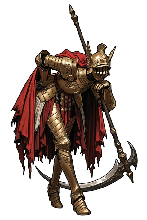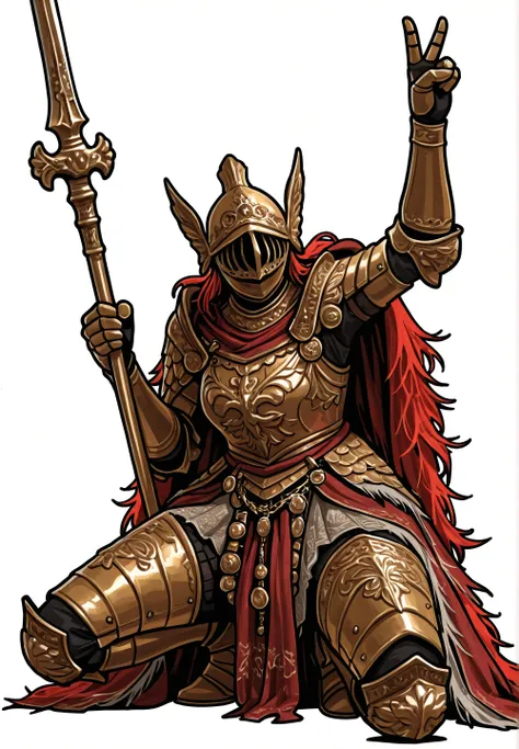 Cleanrot KnightGolden armorelden ringcurvy Vertical slit visor helmOrnate chest armorEtched breastplate designScarlet cloth sashWhite hanging tasselswhite Layered fabric skirt