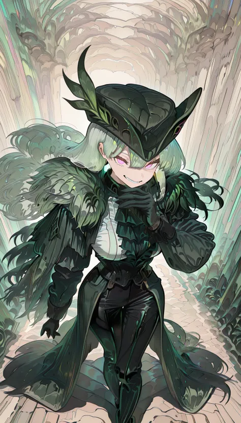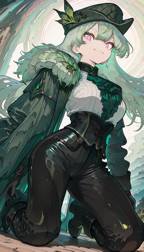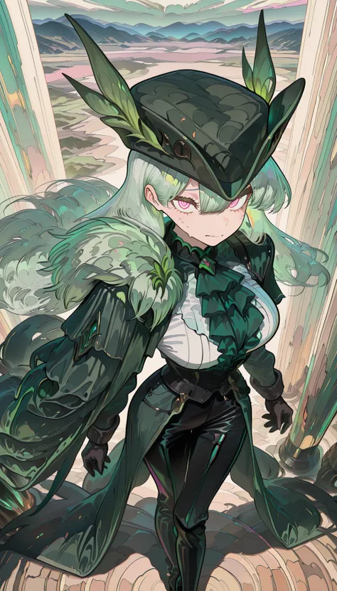 greenborne, 1girllight green hair, long hair, straight hair, green ruffle, white blouse, pink eyes,tricorn hat, feathered hat, ruffled blouse, black corset, green cloak, asymmetrical cape, leather pants, thigh-high boots, gloves, fur trim, long coat,