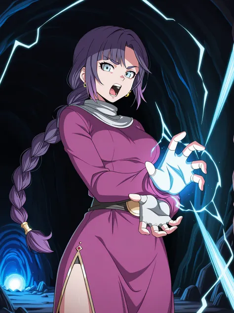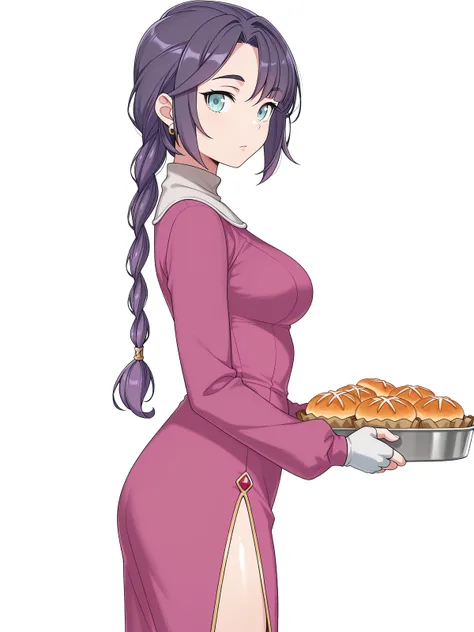 mona, blue eyes, purple hair, long hair, braid, braided ponytail, parted bangs, mature female, medium breasts, anime screencap,fingerless gloves, hoop earrings, jewelry, white muffler scarf, side slit, pink dress, long sleeves,