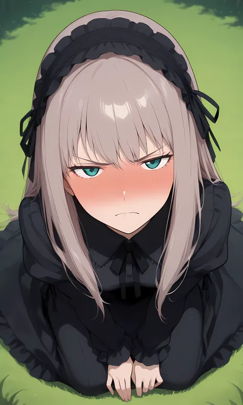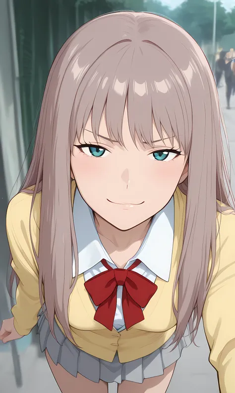 chikako ubukata, aqua eyes, gray hair, long hair, straight hair, bangs, small breastsschool uniform, white shirt, yellow collarless jacket, V-neck blazer, long sleeves, light gray pleated skirt, mini skirt, red bowtie, socks, loafers