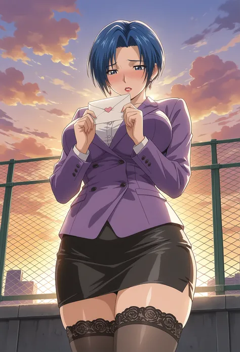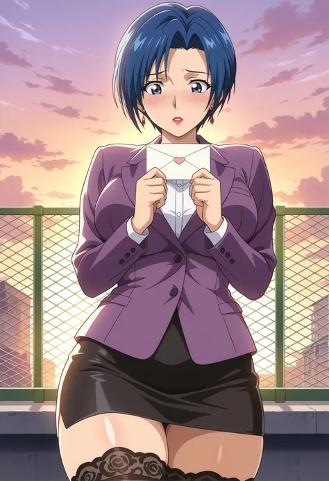 Aojika mizuho, 1girl, mature femaleshort hair, blue hair, blue eyes, lipstick, earringslace-trimmed legwearorange sweaterlace trim, black bra, open shirt, naked shirt, bottomless, black panties
