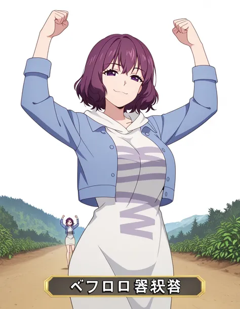 tang rou, short hair, purple eyes, purple hair, mature female, medium breasts, anime screencapjacket, hood, hoodie, blue jacket, dress,