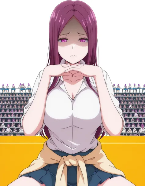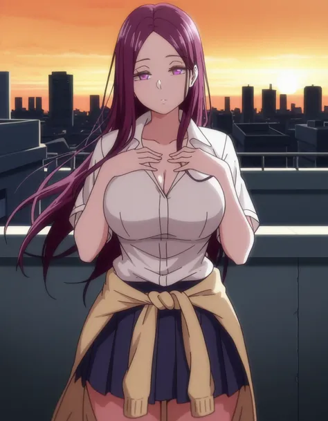 yukina sasaki, long hair, purple eyes, purple hair, mature female, large breasts, anime screencapshirt, white shirt, collared shirt, short sleeves, collarbone, cleavage, skirt, pleated skirt, blue skirt, clothes around waist, sweater around waist,