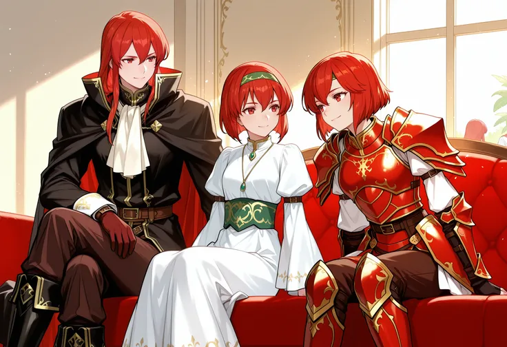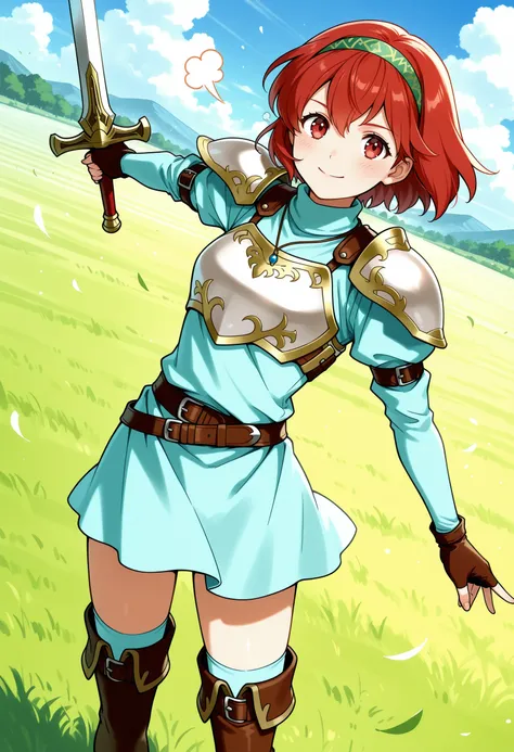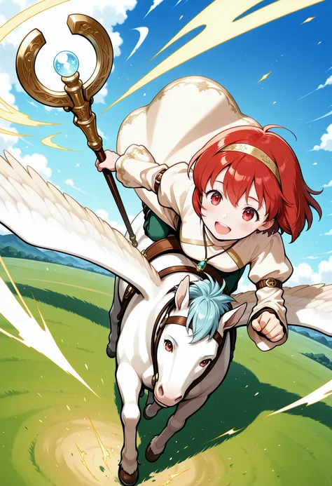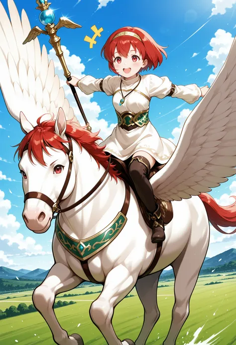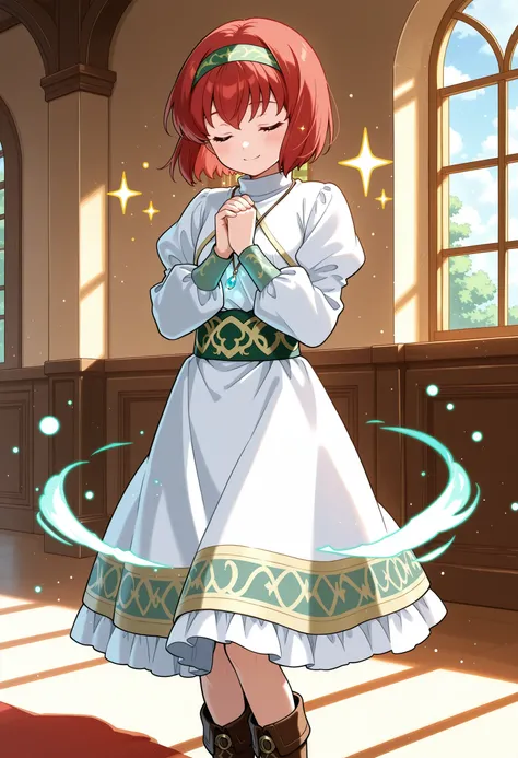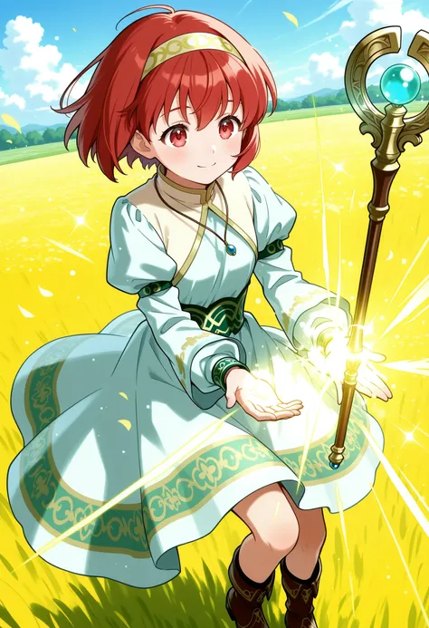 maria_(fe),white dress,red hair,short hair,boots,red eyes,smile,hairband,jewelry,long sleeves,pendant,bootsholding staffhealingaura