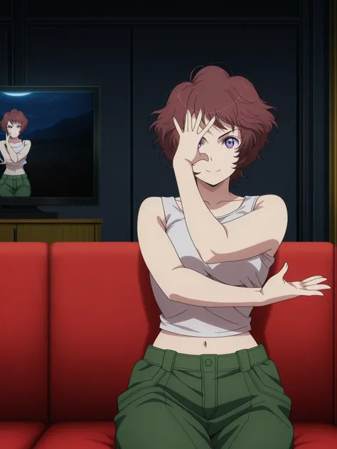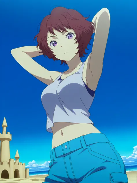 rayet areash, short hair, brown hair, purple eyes, red hair, medium breasts, anime screencap,hood, hoodie, shorts, denim shorts,collarbone, midriff, tank top, jumpsuit