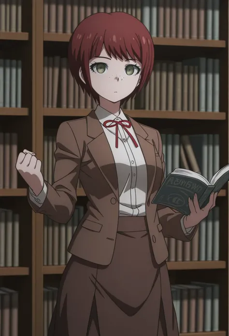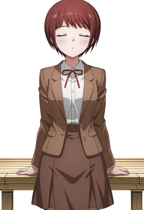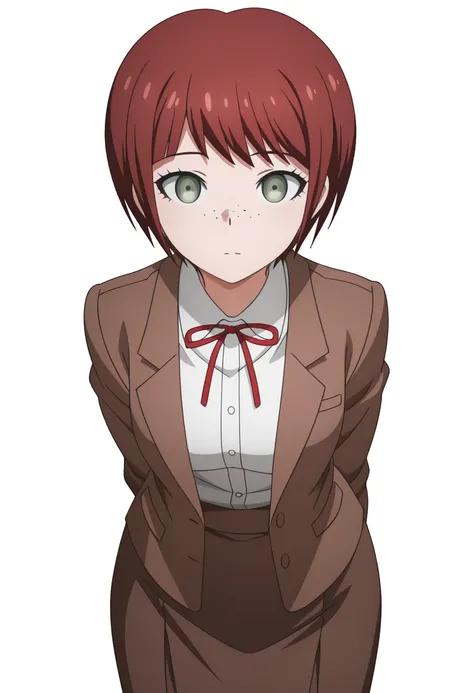 mahiru koizumi, short hair, bangs, green eyes, red hair, freckles, mature female, small breasts, anime screencapshirt, long sleeves, ribbon, jacket, white shirt, red ribbon, neck ribbon, brown jacket, skirt, brown skirt,