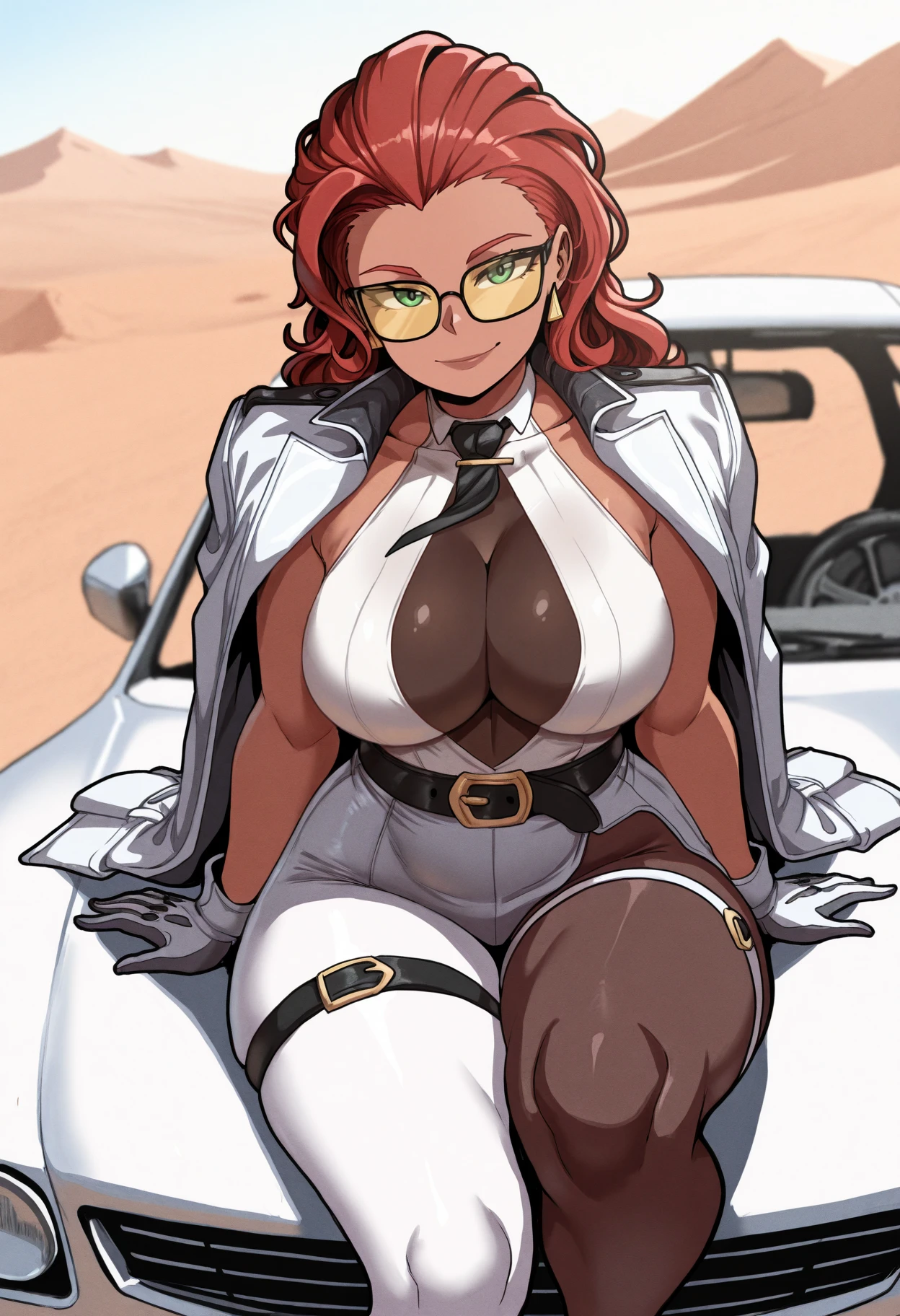 repircred hair, long hair, green eyes, glasses, yellow-tinted eyewear, dark-skinned female, mature female, triangle earringswhite shirt, sleeveless shirt, cleavage cutout, see-through cleavage, black necktie, white jacket, jacket on shoulders, white shirt, white gloves, black belt, white thigh strap, pantyhose