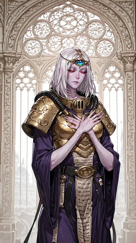 RogueTraderCassiaOrsellio1girl, pale skin, purple skin, white hair, medium hair, albino, red sclera, third eye, purple dress, very long dress, parted hair, gills, purple veins, golden breastplate, skinny, long fingers, claws, tiara, forehead jewel, long sleeves,