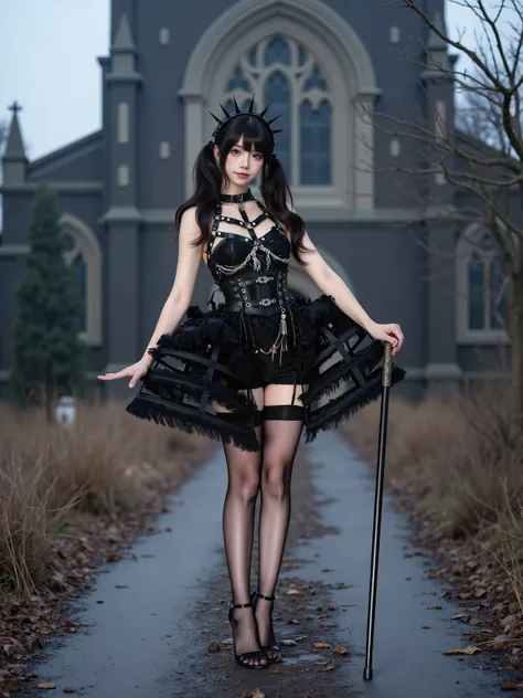 A realistic photo of a slender beautiful young woman in cyb dress. She is also wearing black thighhighs and high heeled sandals.