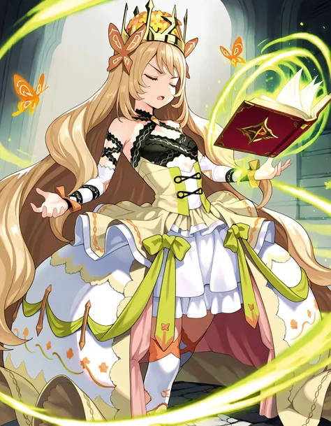 celine fee,crown,butterfly hair ornament,bridal gauntlets,halterneck,black bra,dress,overskirt,footwearninja celine,hat,bridal gauntlets,sleeveless kimono,obi,white skirt,thighhighs,tabimaid celine,maid headdress,butterfly hair ornament,black bowtie,white gloves,maid apron,puffy short sleeves,dress bow,white pantyhose,brown loafers