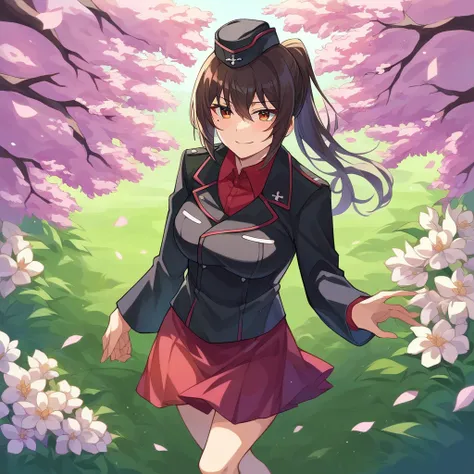 AAMiho, 1girl, brown hair, short hair, brown eyes, nishizumi maho, kuromorimine school uniform, black socks, black skirt, dress shirt, pleated skirt, grey shirt, long sleeves, miniskirt, , black footwear, loafers, wing collar BBMiho, 1girl, nishizumi maho, brown eyes, short hair, brown hair, kuromorimine military uniform, , military hat, , red shirt, black headwear, black jacket, long sleeves, garrison cap, dress shirt, insignia, wing collar, red skirt
