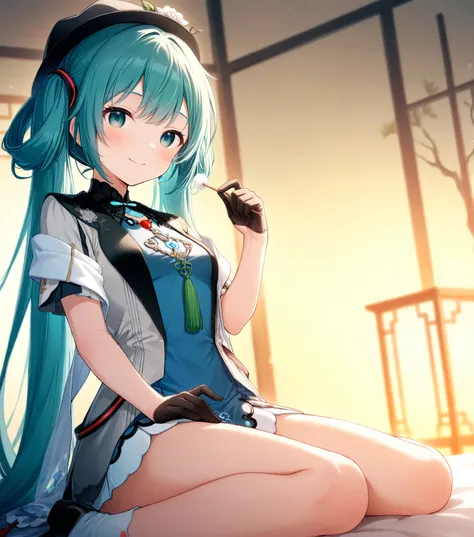 hatsune miku \(miku with you 2021\)hatsune mikuvery long aqua hairhair ringsaqua eyestwintailsblack headwearhat flowerwhite roseblack half gloveschinese clothesjewelryblue dressshawltasselwhite socksblack footwearbare legs