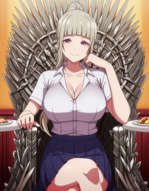 ruri kurumizaka, long hair, bangs, purple eyes, ponytail, blunt bangs, pink eyes, high ponytail, mature female, large breasts, anime screencapshirt, white shirt, collared shirt, short sleeves, collarbone, cleavage, skirt, pleated skirt, blue skirt,