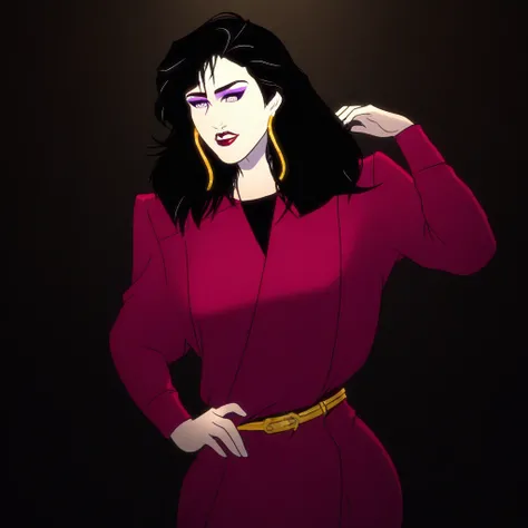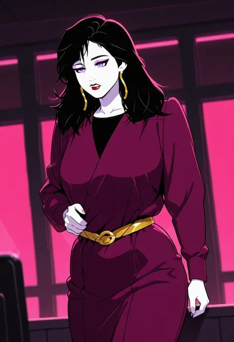 PizzazMillerMC, 1girl, solo, pale skin, black hair, long hair, bangs, messy hair, earrings, purple eyes, eyeshadow, makeup, full lips, red lipstick, plum purple dress, large breast, belt, thick thighs, long sleeves, shoes,