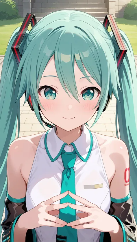 Hatsune Miku-Project SEKAI versionabsurdly long hair,aqua hair,twintails,hair ornament,sidelocks,hair between eyes,parted bangs,aqua eyesopen mouth,hands up,holding microphone,singingwhite shirt,collared shirt,bare shoulders,sleeveless shirt,aqua necktie,detached sleeves,black sleeves,shoulder tattoo,miniskirt,pleated skirt,fringe,zettai ryouiki,black thighhighs,thigh boots
