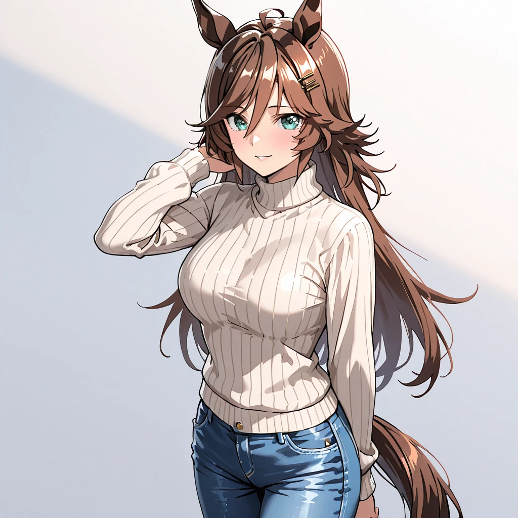 MrCB, 1girl, animal ears, hat bow, strapless shirt, white pants, mini hat, horse tail, midriff, navel, yellow choker, brown hair, green shirt, white jacket, hair between eyes, bangs, wrist cuffs, white headwear, open clothes, horse girl, crop top, hairclip, single sleeve, mini top hat, hair ornament, open jacket, long sleeves, green bow, medium breasts, collarbone, stomach, green eyes, cropped jacket, cowboy shot