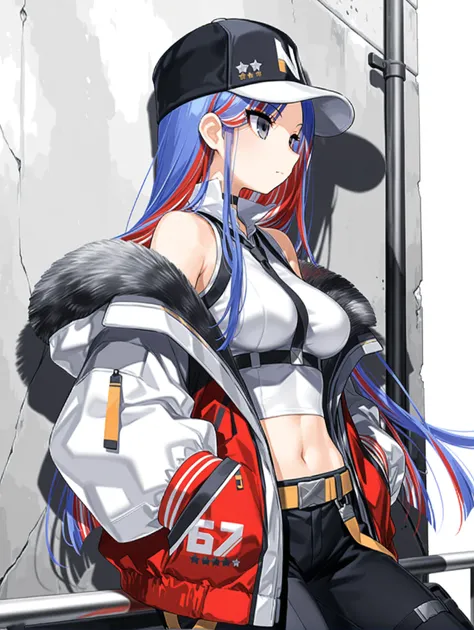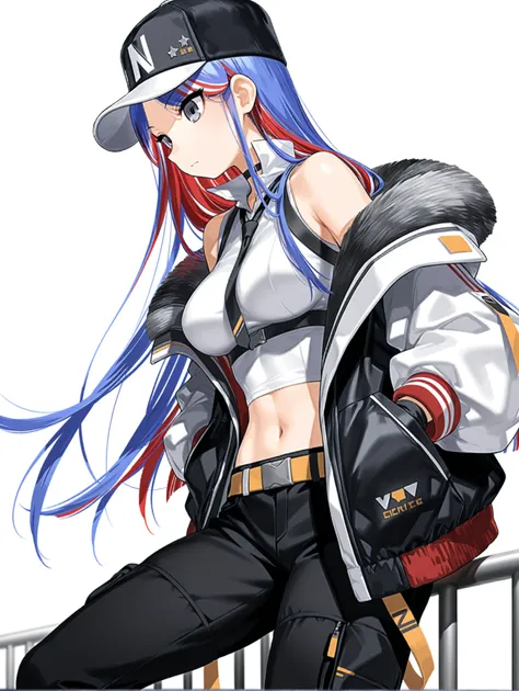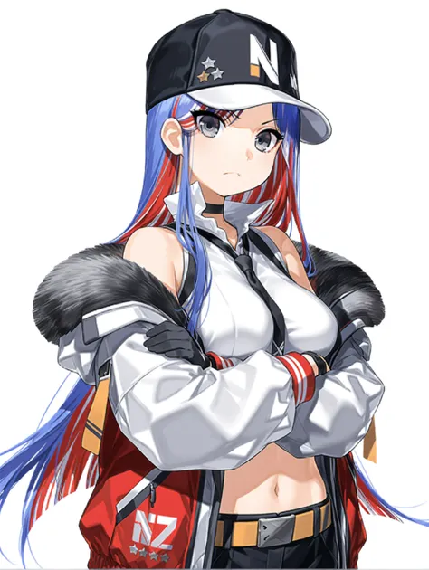 s_hg,headgear,B_B_s_dakota,long hair,multicolored hair,grey eyes,s_clothes,black necktie,crop_top,black sleeves,open clothes,midriff,navel,pencil_skirt,single leg pantyhose,armored boots,a_flag,american flag,