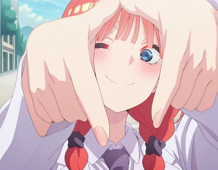 <lora:yoshikage-kira-finger-frame-illustriousxl-lora-nochekaiser:1>, yoshikage kira finger frame, finger frame, hands up, outstretched arms, foreshortening, solo, looking at viewer, smile, upper body, outdoors, necktie, one eye closed, parody, meme,
