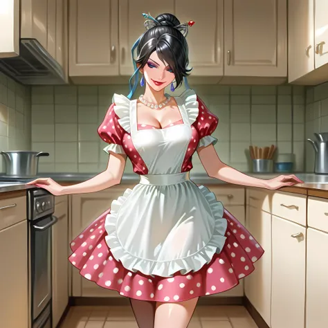 50shous3wif3dress, puffy sleeves, waist apron, pearl necklace, jewelry, earrings, lipstick, makeup