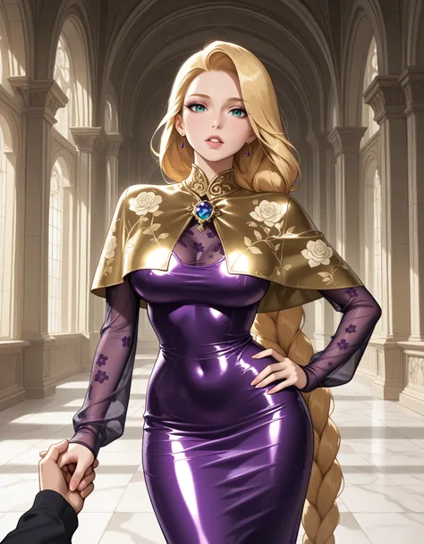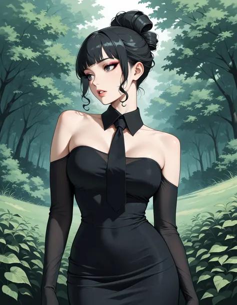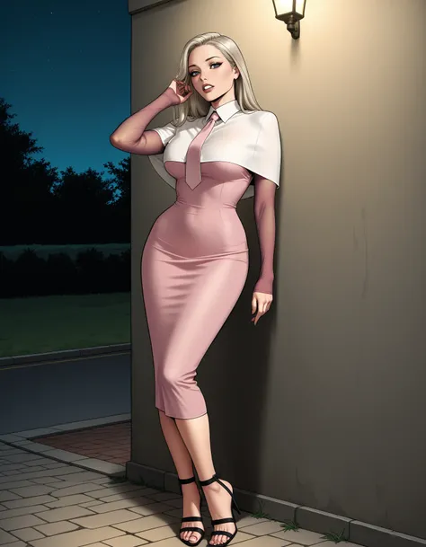 white capelet, shirt collar, black dress, see-through sleeves, sleeves past wrists, knees, strappy heels, black necktie