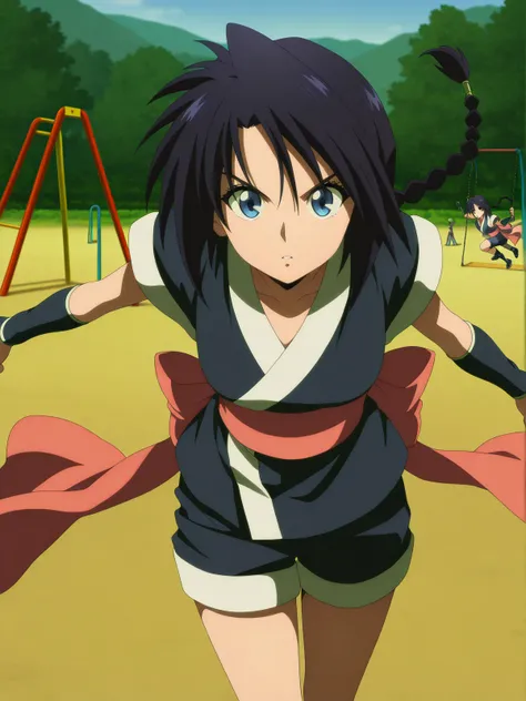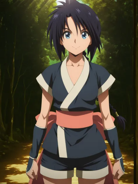 misao makimachi, long hair, blue eyes, black hair, braid, single braid, mature female, small breasts, anime screencapshorts, sash, japanese clothes, ninja,