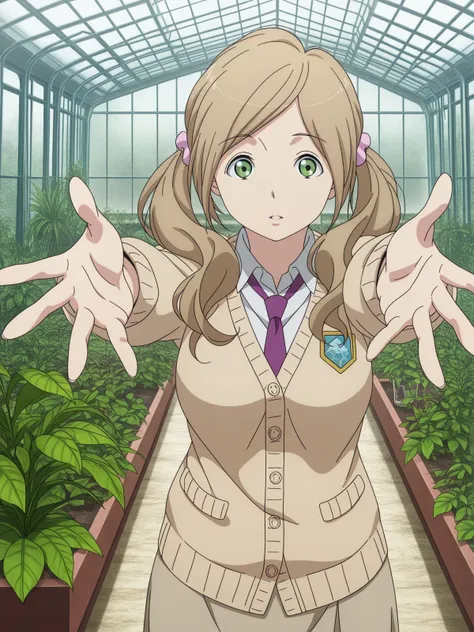 nina klein, long hair, brown hair, green eyes, twintails, scrunchie, mature female, medium breasts, anime screencap,skirt, necktie, cardigan, necktie,