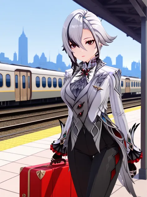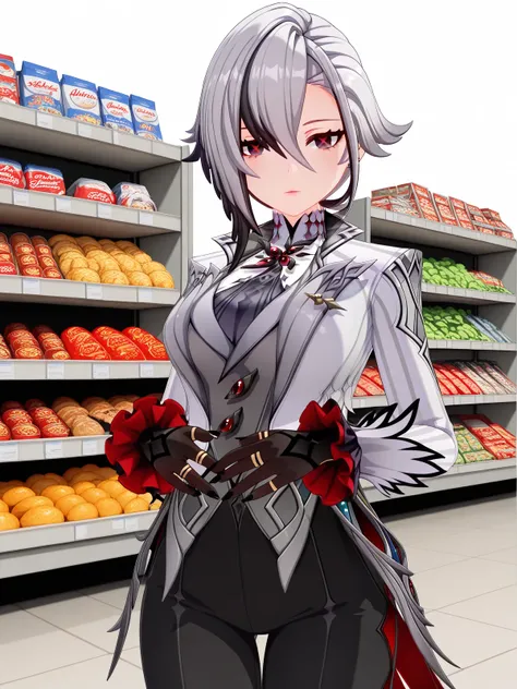 arlecchino, arlecchino (genshin impact), short hair, black hair, hair between eyes, white hair, grey hair, multicolored hair, black eyes, two-tone hair, streaked hair, symbol-shaped pupils, red pupils, x-shaped pupils, mature female, large breasts, 3dlong sleeves, gloves, jacket, black gloves, pants, coat, black pants, suit,