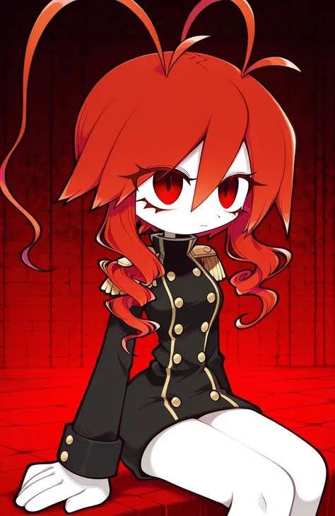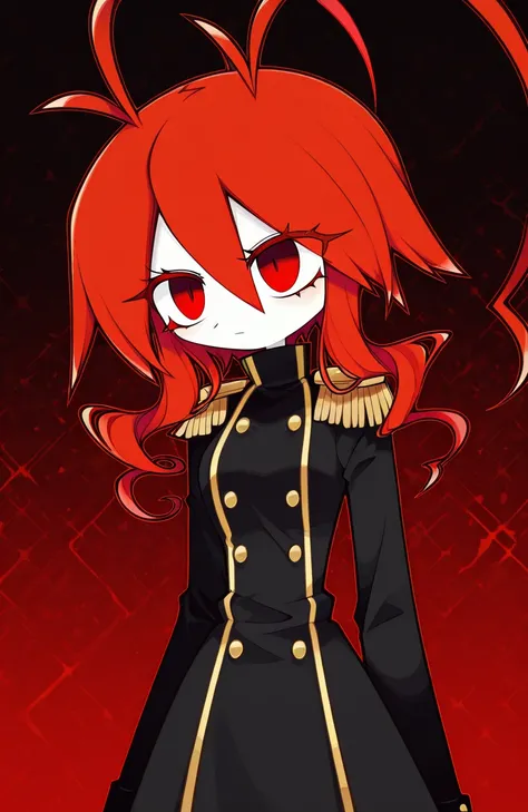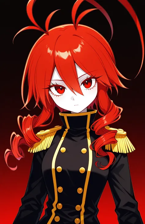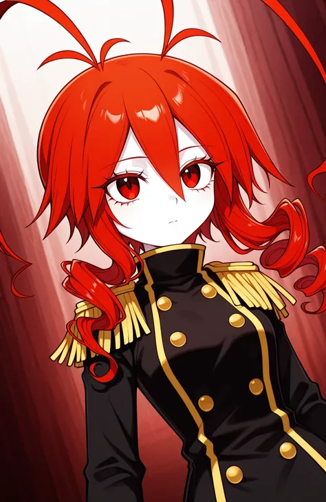 lobco \(funamusea\),LobcoOkgeom,1girl,antenna hair,drill hair,eyelashes,hair between eyes,long hair,pale skin,red eyes,red hair,twin drills,black jacket,double-breasted,epaulettes,high collar,jacket,military,military uniform,uniform,