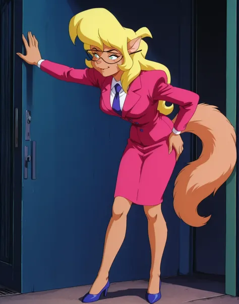 Callie_BriggsSWCT, glasses, blond hair, long hair, green eyes, furry, tail, anthro, glasses, necktie, pink formal, suit, skirt, pencil skirt, pointy ears,retro artstyle, 1990s (style),blue high heels,pink sweatshirt, pink sweatpants pants,