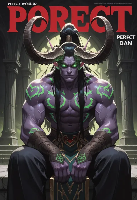 WoWIll1dan, 1boy, male focus, pointy ears, glowing eyes, green eyes, black hair, long hair, ponytail, half up, demon horns, demon boy, colored skin, no pupils